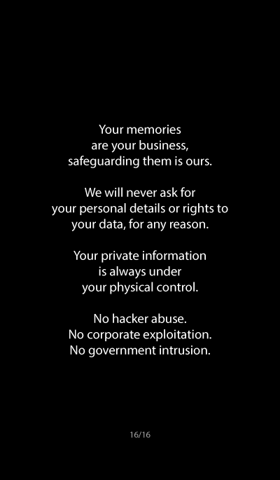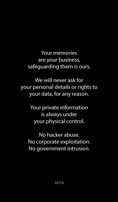 Vos données sont vos affaires, les sauvegarder c’est notre affaire. Nous ne vous demanderons jamais vos informations personnelles ni vos droits sur vos données. Vos informations personnelles restent sous votre contrôle physique permanent. Aucun piratage. Aucune exploitation entrepreneuriale. Aucune intrusion gouvernementale.